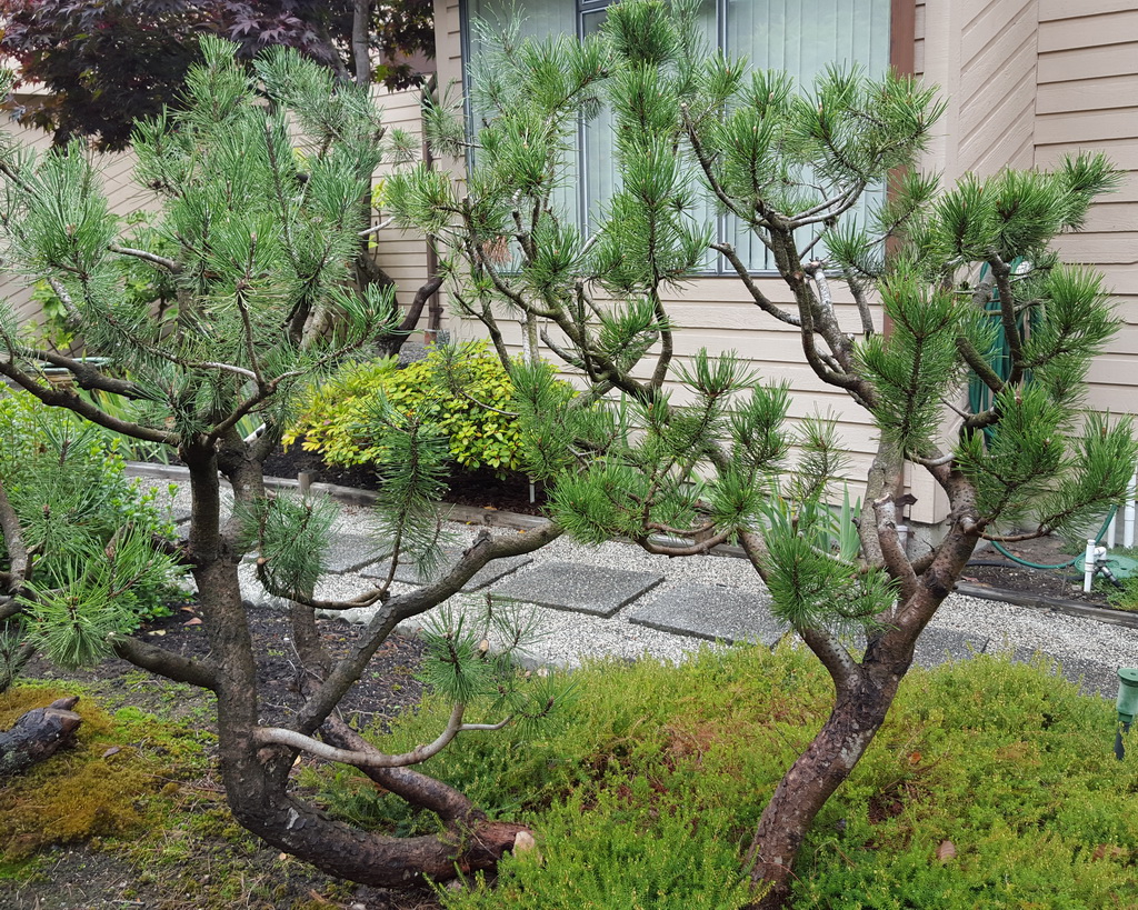 A Mugo Pine with two major trunks that previously was First it was pruned to a simplified structure with selected branches to form the basis for future improvements (2015) Second photo shows healthy fresh growth that has filled in to show a nice shape (2 yrs later) |